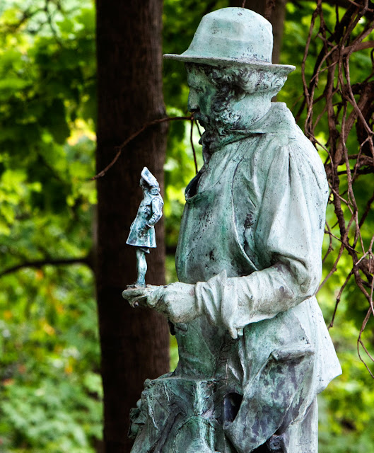 The statue is surrounded by three bronze bas-reliefs, representing his most well-known work: